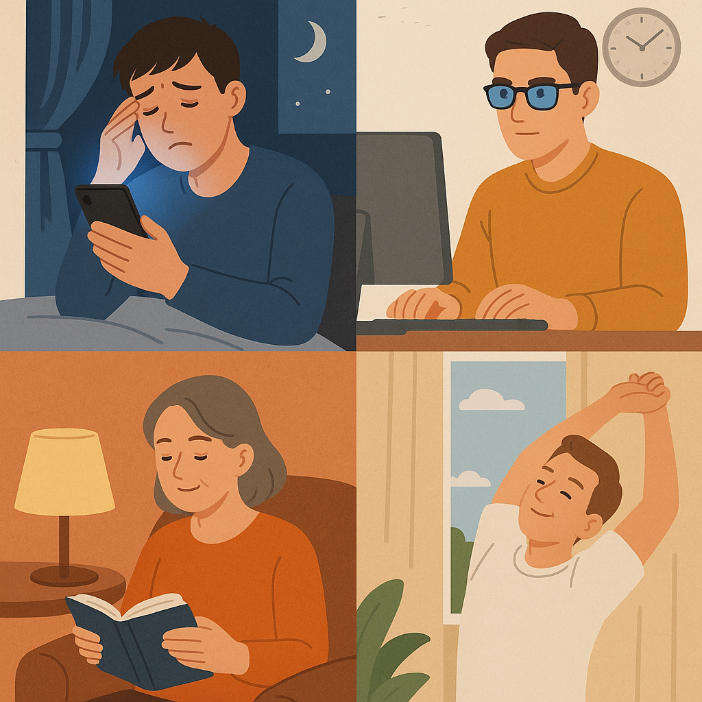 멜라토닌 분비 증가 → 더 빨리 잠들고 깊은 수면 가능 - 눈 피로 감소: 장시간 업무 시 블루라이트 필터 안경 또는 화면 조정이