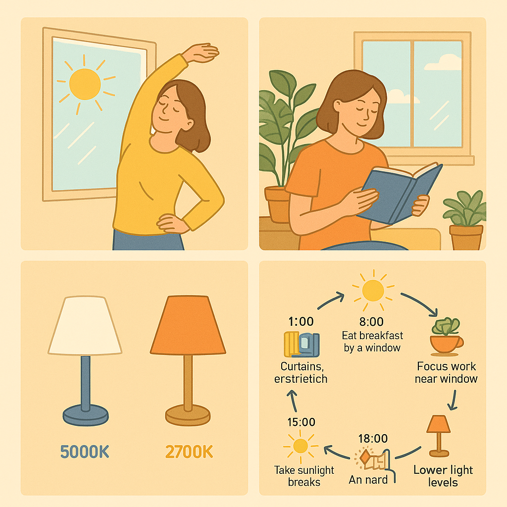 - 동향 창문: 아침 햇살 → 기상 리듬 회복
